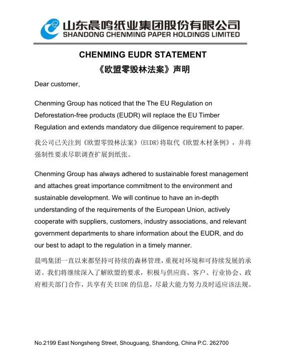 晨鳴集團《歐盟零毀林法案》EUDR聲明